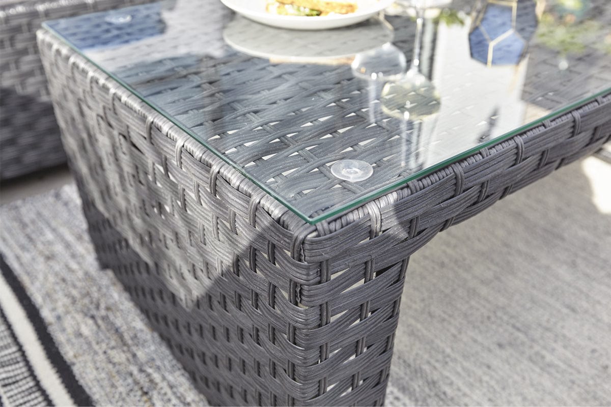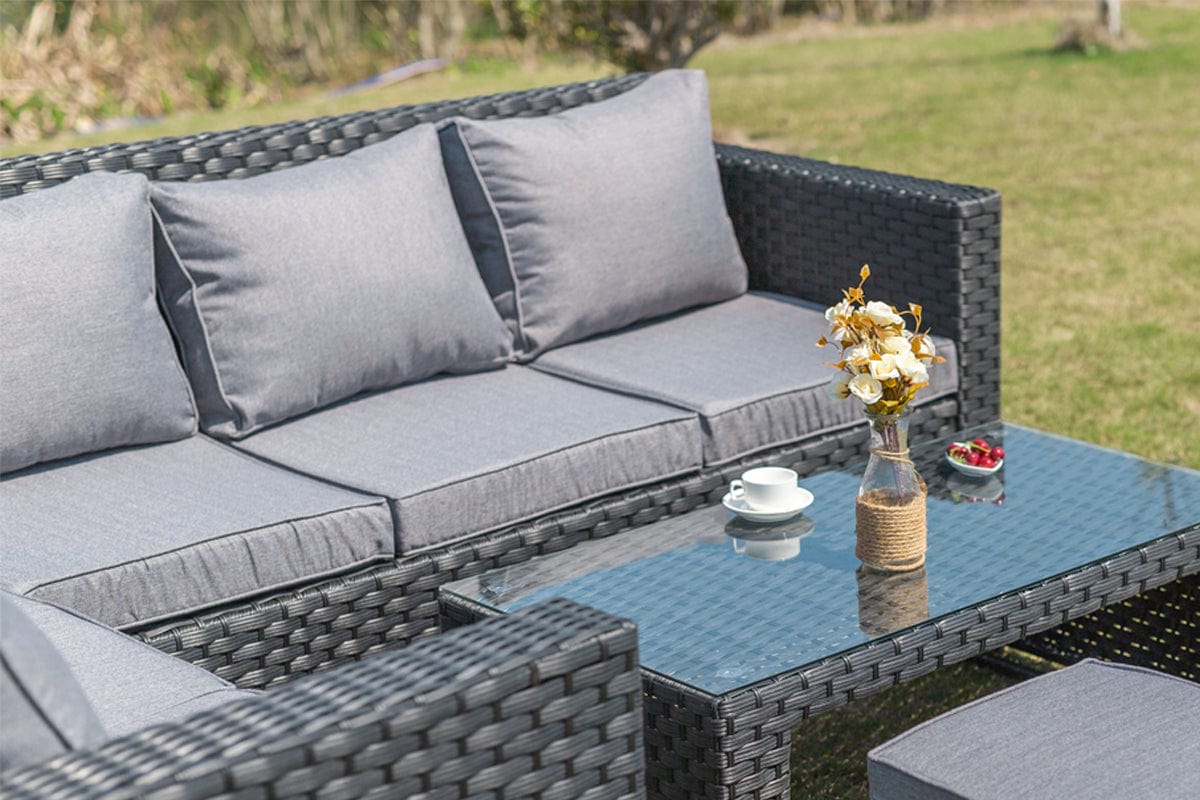 When you invest in your home you should expect only the best. That’s why Furniture Maxi has developed such a strong reputation for delivering exceptional garden furniture to suit any home. For example, take a look at this 8-seater black rattan garden furniture sofa set. Made from premium PE rattan weave it offers superior UV protection and weather resistance our garden furniture will last for years to come. This Yakoe Barcelona rattan set includes a 3-seater sofa, 3-sided sofa, 2 footstools, and coffee table – giving you style and comfort for relaxing and entertaining whenever you need.
