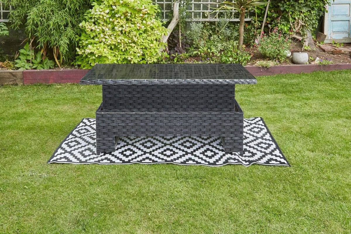 The Barcelona Rattan Garden Dining Set with rain cover is a good choice for those who want a stylish and practical outdoor furniture set. The lift-up coffee table feature is perfect for entertaining guests or enjoying a meal outdoors. The sleek design and easy-to-use functionality make this product a must-have for any event. This durable and low-maintenance set is sure to provide years of enjoyment.