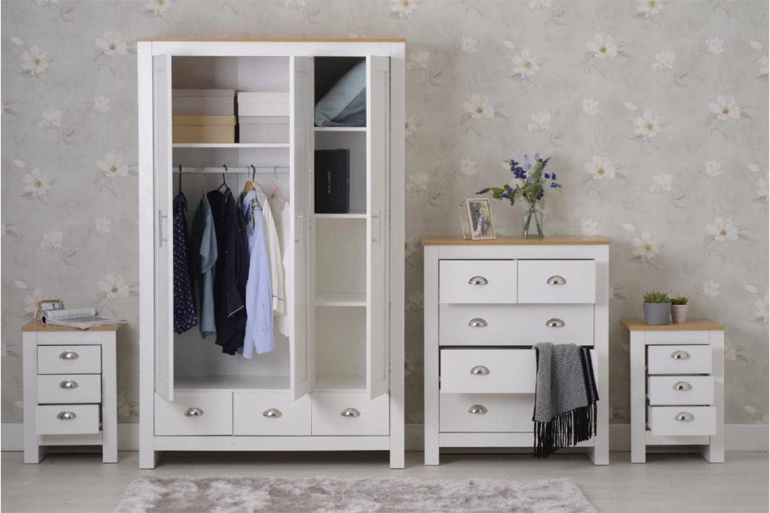This stylish 4 Piece White Bedroom set inspired furniture set that will be perfect for kitting out a bedroom in a first-class style. The sleek lines, soft white,grey or blue foiled finish with oak tops and brushed steel handles create a sophisticated impression. The wardrobe, 3+2 drawer chest,5 drawer tall chest and beside table provide effective storage with a good mix of hanging, drawer and shelf space. Ideal for a room where understated elegance is the goal. It will brighten and complement the desired room.