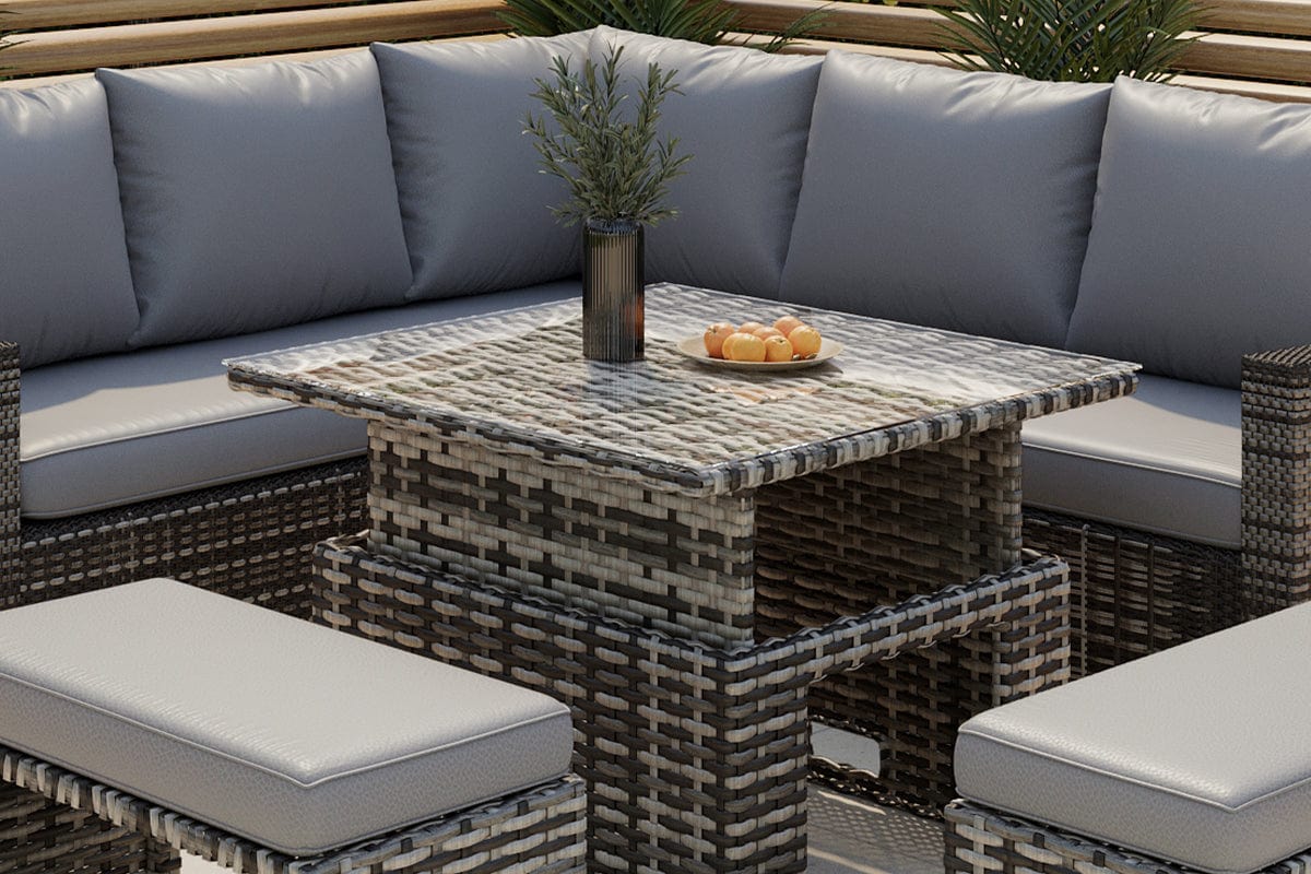 Rosen Rattan Garden Furniture 9 Seater Corner Sofa Rising Table Set With 2 Benches In Grey