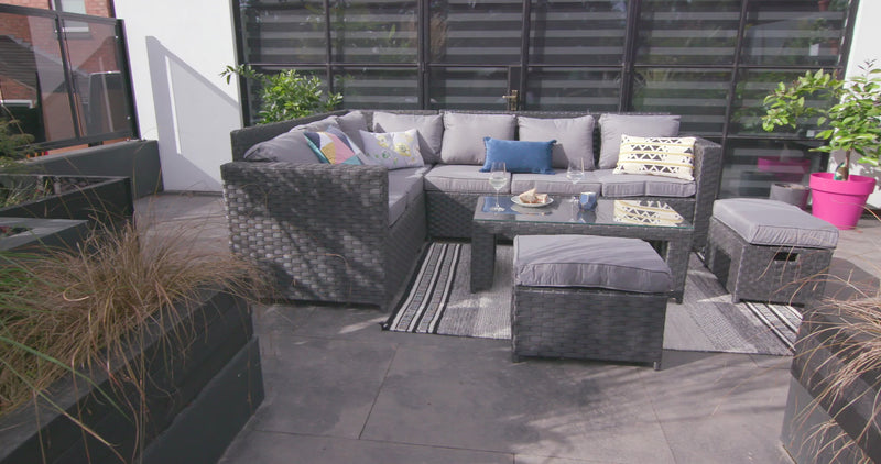 When you invest in your home you should expect only the best. That’s why Furniture Maxi has developed such a strong reputation for delivering exceptional garden furniture to suit any home. For example, take a look at this 8-seater black rattan garden furniture sofa set. Made from premium PE rattan weave it offers superior UV protection and weather resistance our garden furniture will last for years to come. This Yakoe Barcelona rattan set includes a 3-seater sofa, 3-sided sofa, 2 footstools, and coffee table – giving you style and comfort for relaxing and entertaining whenever you need.