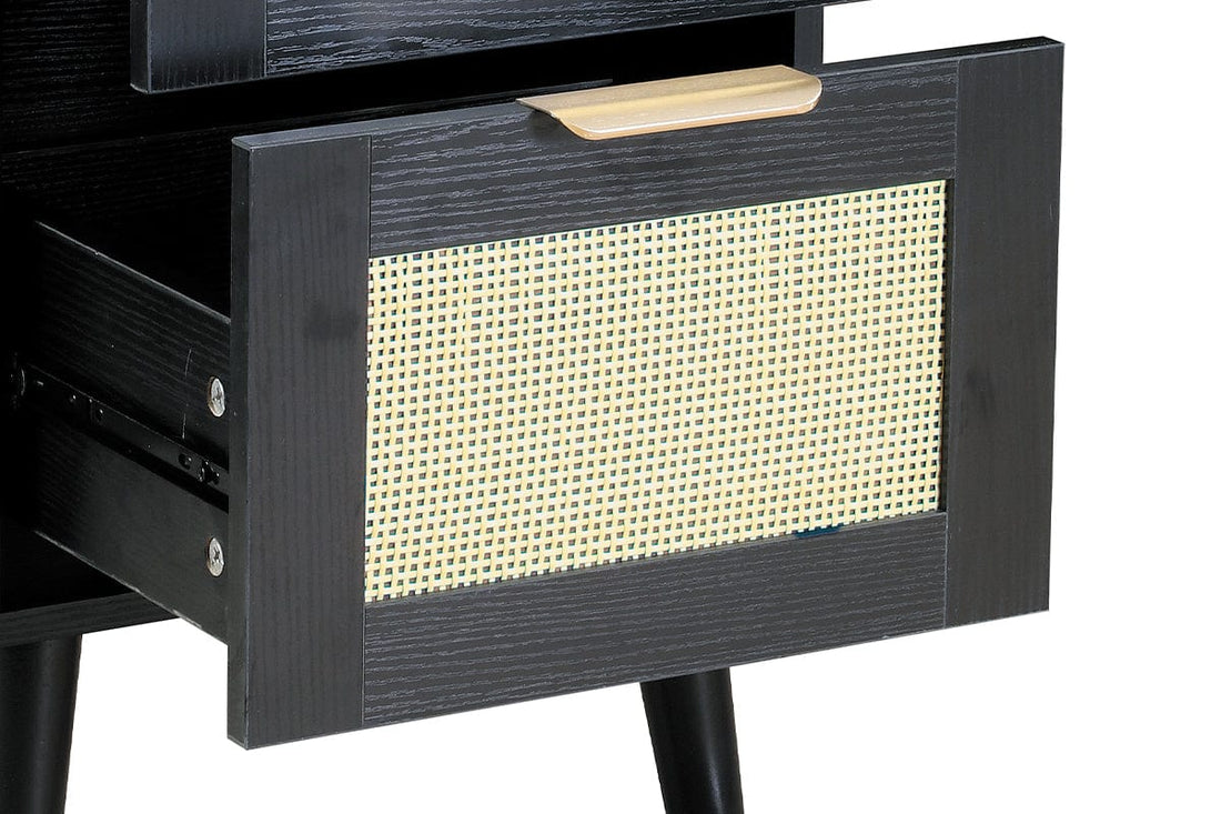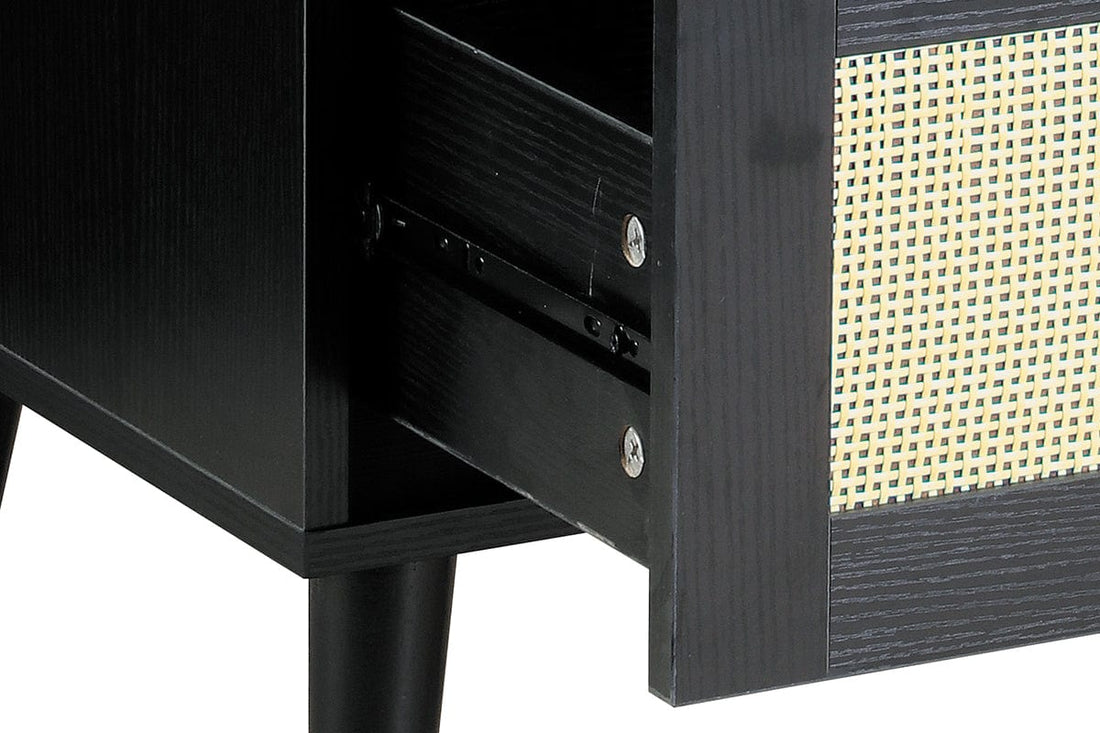 Our bedside cabinet features a sturdy particle board with sleek melamine paper and solid wood legs painted in sophisticated black, which is designed to last and impress. And the rattan-decorated drawers provide enough storage space and are perfect for anyone looking to add a touch of organic texture and warmth to their space. This piece effortlessly combines modernity with rustic charm, adding an edgy yet warm vibe to any room.
