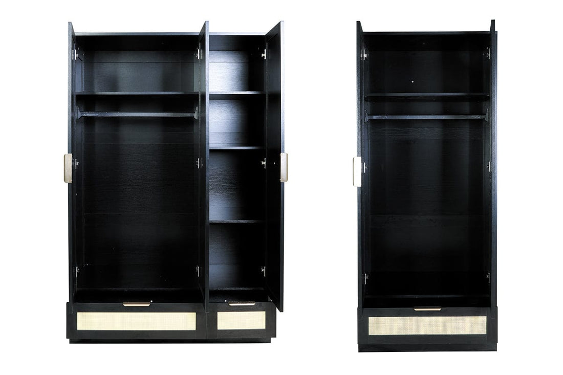 Crafted with 15/12mm particle board wrapped in sleek melamine paper, these wardrobes aren't just eye candy. They're built to last, ready to hold your treasures securely. Each door and drawer is adorned with beautiful rattan decoration, bringing that laid-back, earthy vibe right into your bedroom. It's industrial chic meets tropical retreat! With ample storage space hidden behind its enchanting exteriors, you'll have plenty of room for everything. It's like having your boutique!