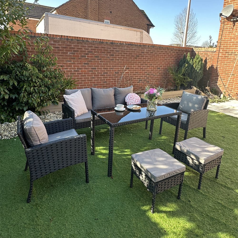 Designed for style, comfort, and practicality, this set is perfect for hosting backyard gatherings, enjoying family dinners under the stars, or simply sipping your morning coffee in the sunshine. Featuring luxuriously padded cushions on seven spacious seats, the Eton invites everyone to relax in comfort. The sleek, all-weather rattan weave is as durable as it is stylish, withstanding the elements while adding a touch of modern elegance to your garden. The matching table completes the look, providing just the spot for snacks, drinks, or decorative accents.