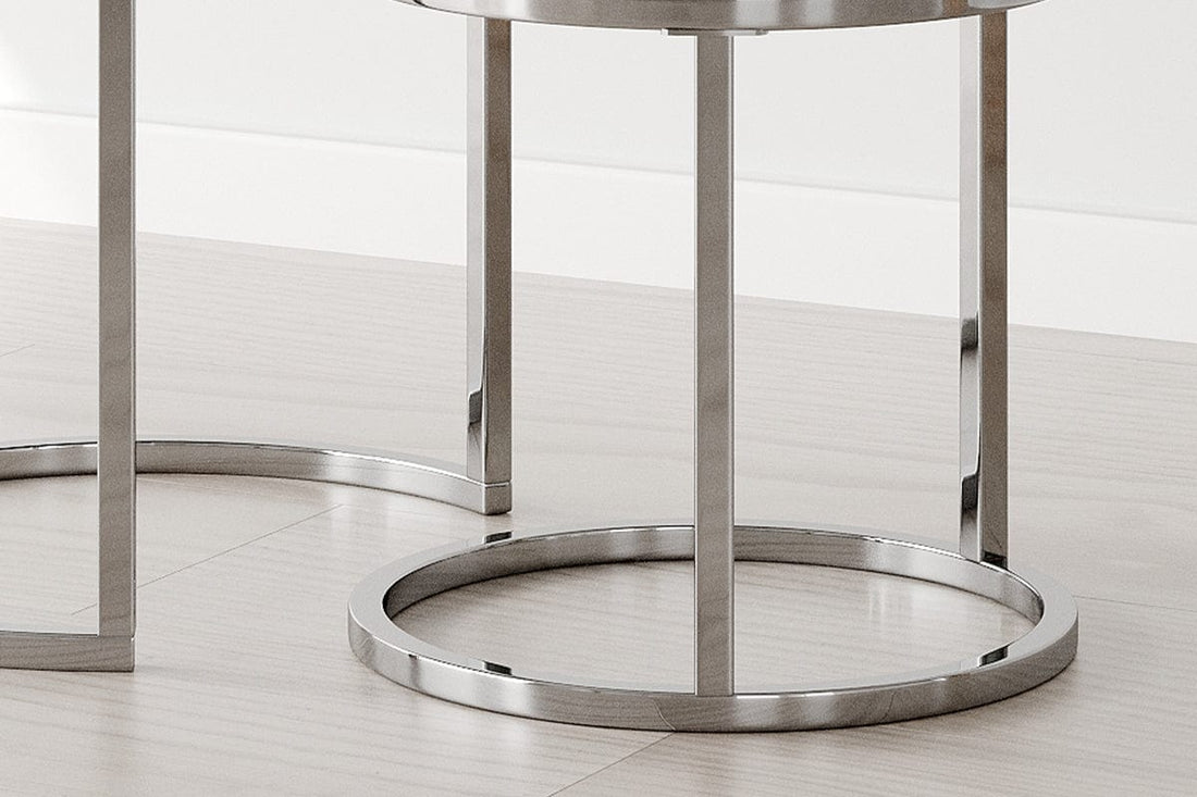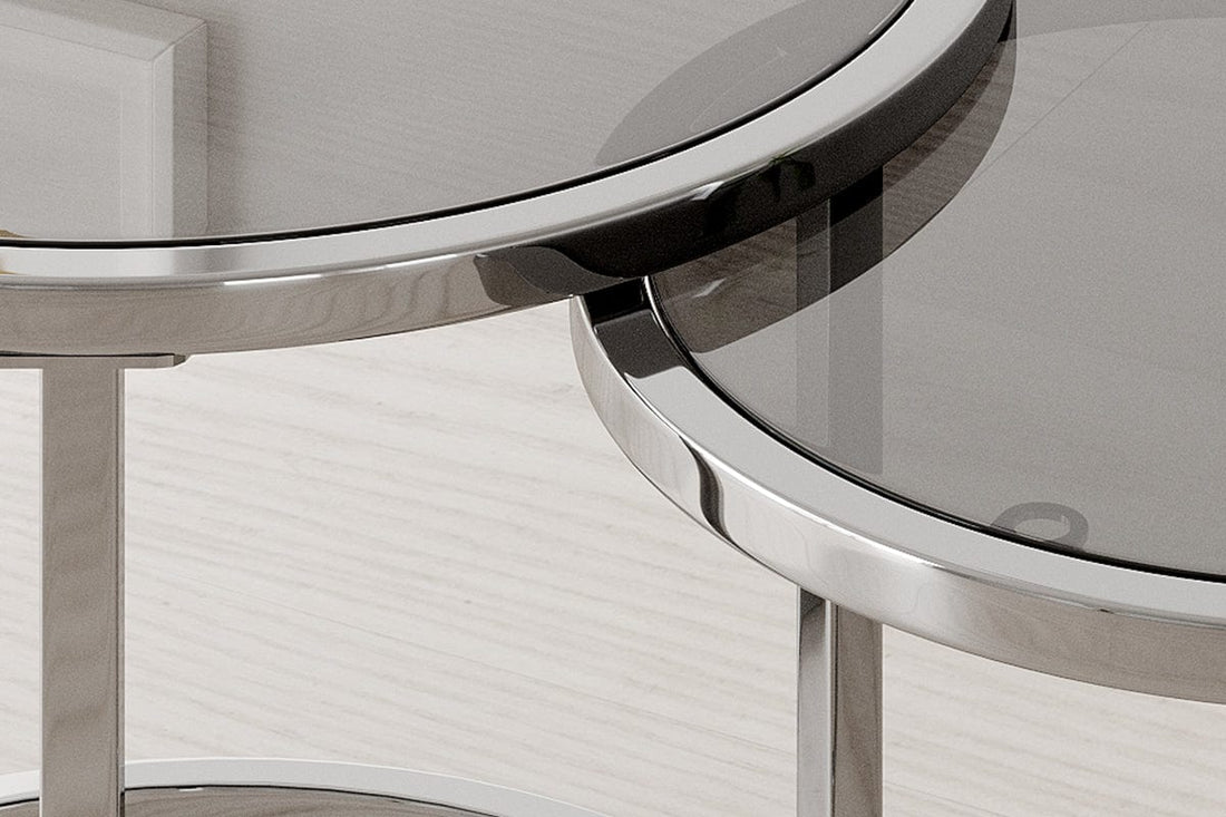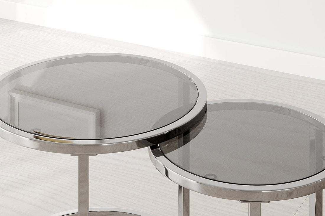 The sleek silver frame adds an industrial touch while the 6mm thick glass top is strong and durable. With the ability to nest within each other when not in use, your space is kept tidy and organized at all times. The perfect addition to any modern home, the Etta coffee table is the ideal blend of practicality and style.