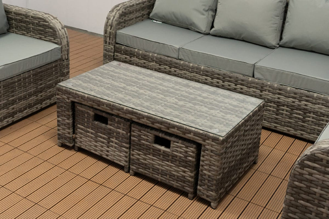 To really enjoy your garden in style you need to spend as much time as possible soaking in its atmosphere. It’s a personal space you work hard to enjoy and by adding in this 7-seater grey rattan garden furniture set you can really bring the space alive. Use it to enjoy breakfast, lunch or dinner outside, or just to spend a relaxing afternoon lost inside your favourite book. The garden chairs work wonderfully as patio furniture, or inside a conservatory, giving you lots of seating options to enjoy. It comes with a 3-seater sofa, 2 x armchairs and a glass-topped coffee table to finish off this beautiful set.