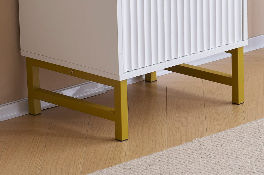 The robust particle board ensures lasting durability, while the melamine coating adds a polished finish. The steel tubes with their golden touch elevate the overall aesthetic, providing a subtle hint of opulence. Adding to its charm is the attractive ridged design, which perfectly combines modern flair with timeless elegance. Whether you're storing your nightly reads, bedtime essentials, or decorative items, the two spacious drawers offer ample space to keep everything neatly organized.