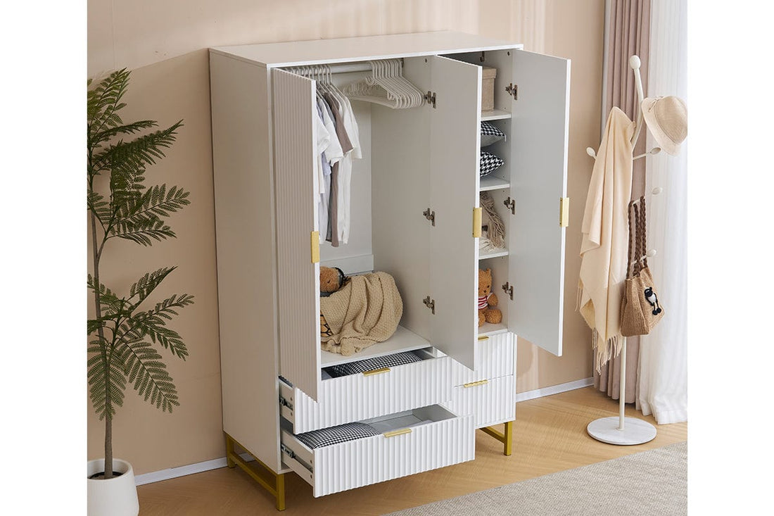 With plenty of room inside, organize your clothes, accessories, and more effortlessly. The 3 doors and 4 drawers open up to a spacious interior, perfect for all your storage needs!