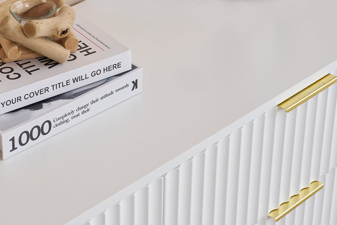 Whether you place it in your bedroom, living room, or hallway, this versatile storage cabinet will seamlessly blend into any setting. The elegant ridged design and gold-accented steel tubes make it a statement piece that enhances the overall ambiance.