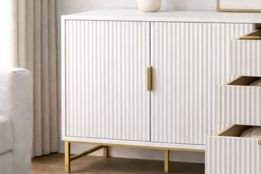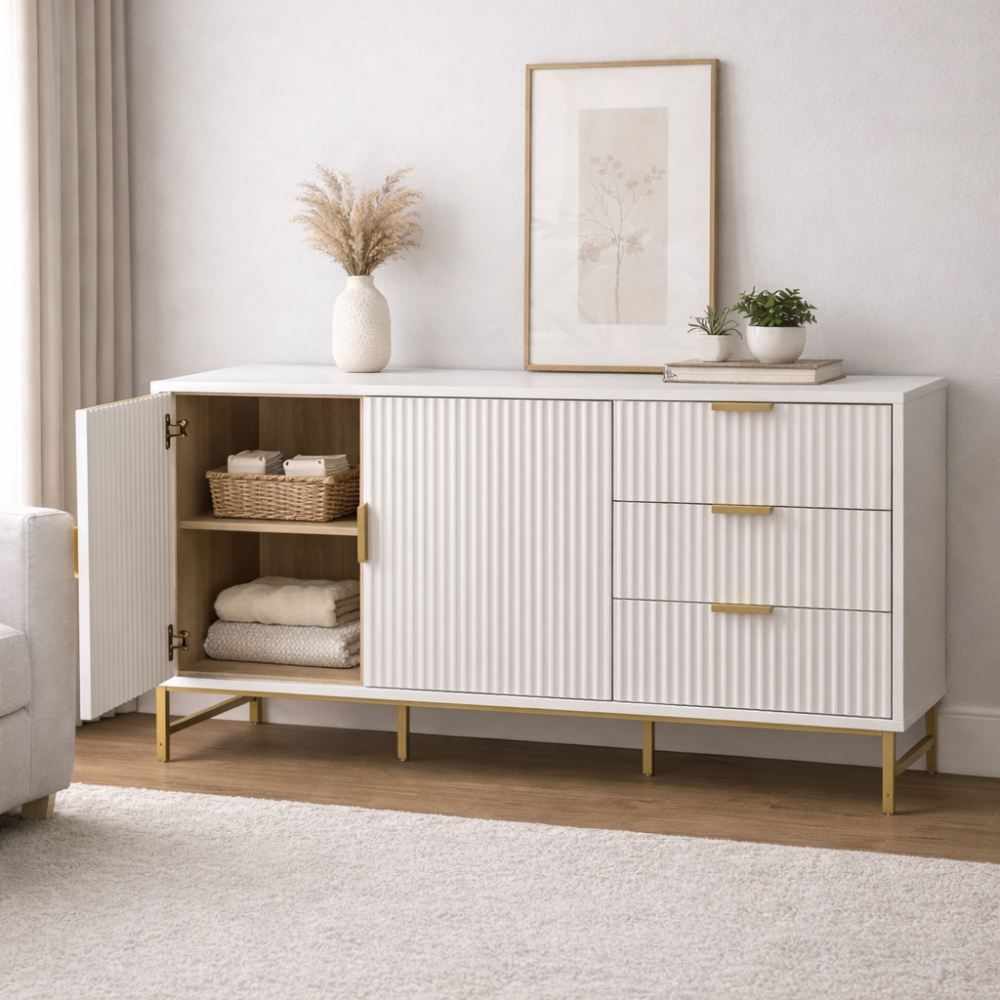 The Mercury extra‑wide sideboard brings a refined touch of contemporary luxury to any living or dining space. Its clean, architectural silhouette is enhanced by matte‑white ridged doors, paired with elegant gold handles and metal legs for a subtle industrial‑chic finish.