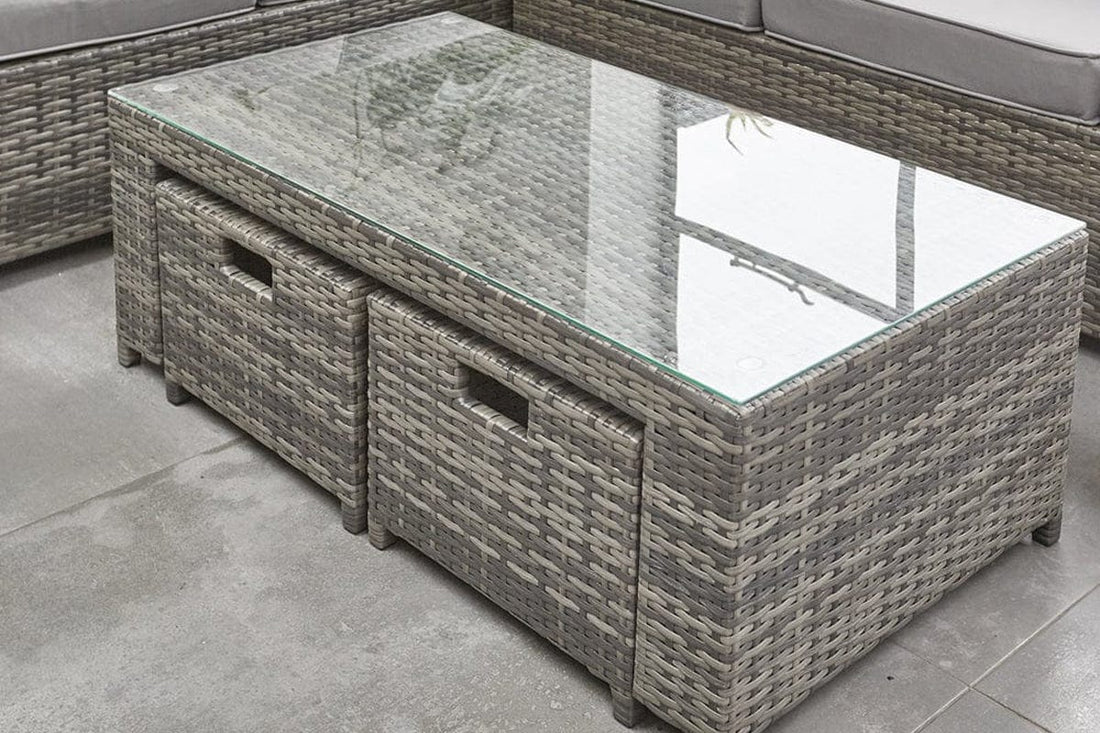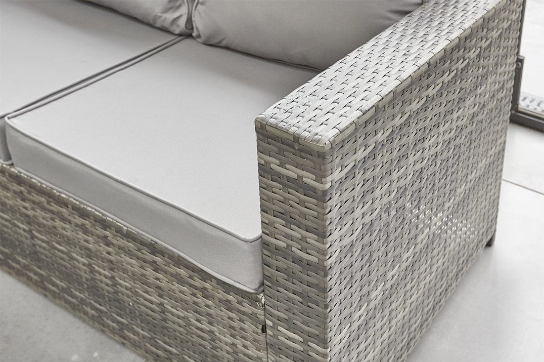 For the perfect combination of style, functionality and comfort, look no further than this 8-seater Yakoe Barcelona rattan sofa set. The luxurious corner design allows you to stretch out in any direction when you have the time and space, while also inviting others to join you in relaxing under the summer sun. This wonderful grey rattan garden furniture set comes with two footstools and a glass-topped coffee table, with padded seat and back cushions that guarantee true comfort. We only use premium PE rattan to ensure high levels of weather resistance and can also supply garden furniture covers to keep the furniture covered from spring through to winter.
