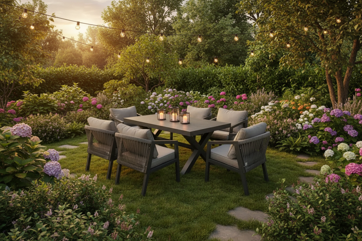 Modern Patio Dining Set for Any Space – Clean lines and a stylish aluminium frame create a contemporary look that fits perfectly on patios, balconies, poolside areas, and outdoor dining spaces