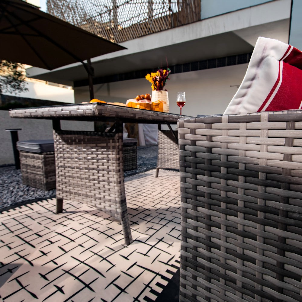 Upgrade your outdoor space with the Rosen 9 Seater Rattan Corner Sofa Dining Table With Parasol Hole Set—the ultimate combination of style, comfort, and practicality! Perfect for hosting lively gatherings or enjoying a quiet al fresco meal with the family, this set comfortably seats nine, making it ideal for everything from casual coffee catch-ups to summer BBQ parties.