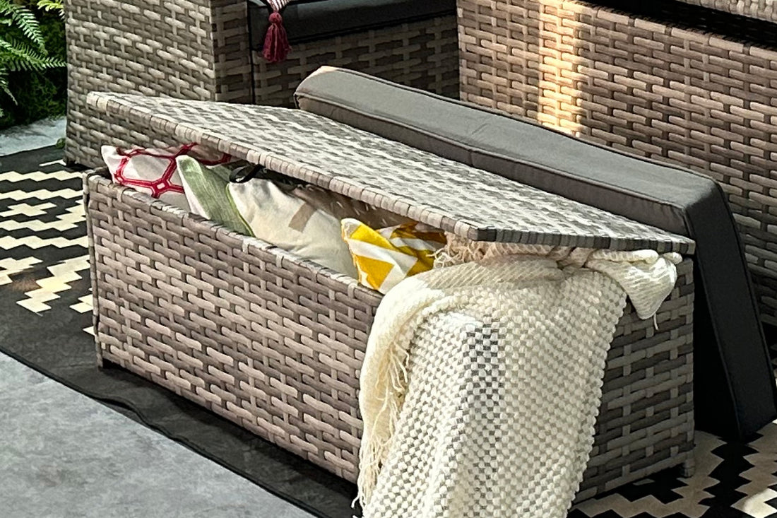 The matching dining table provides ample space for outdoor dining and entertaining, while the included armchair adds extra seating flexibility. The convenient storage box keeps cushions, accessories, and outdoor essentials neatly organized, ensuring your space stays clean and clutter‑free.