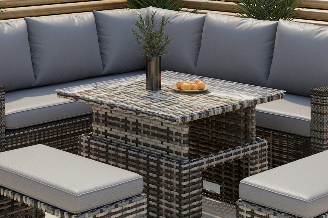 Get ready to elevate your outdoor living experience with the Rosen Rattan Garden Furniture 9 Seater Corner Sofa Rising Table Set With 2 Benches! This ingenious set is designed to bring a touch of luxury and functionality to your patio, allowing you to make the most of your precious outdoor space.