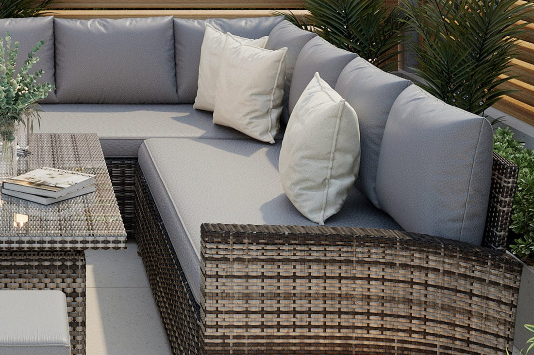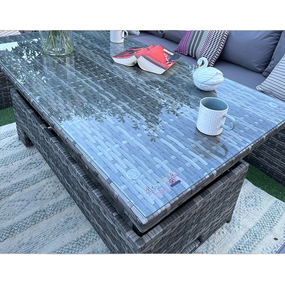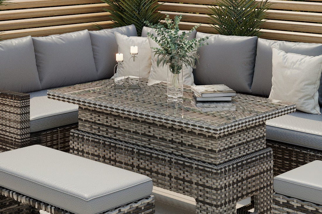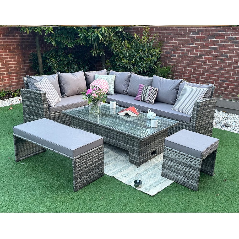 Introducing the ultimate outdoor oasis for relaxing and entertaining - the Rosen Rattan Garden Furniture 9 Seater Corner Sofa Rising Table Set With Bench And Stool! Designed with your comfort and style in mind, this sensational set will transform your garden into a haven of relaxation.
