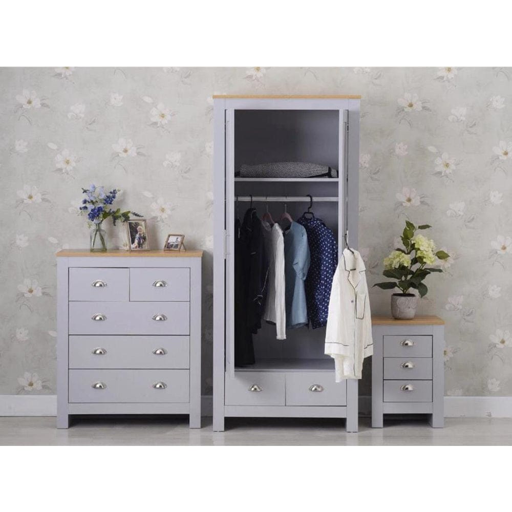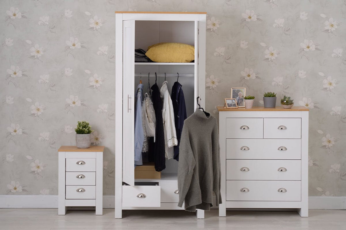 A stylish shaker-inspired furniture set that will be perfect for kitting out a bedroom in a first-class style. The sleek lines, soft white, grey or blue foiled finish with oak tops and brushed steel handles create a sophisticated impression. The wardrobe, 3+2 drawer chest,5 drawer tall chest and beside table provide effective storage with a good mix of hanging, drawer and shelf space. Ideal for a room where understated elegance is the goal. It will brighten and complement the desired room.