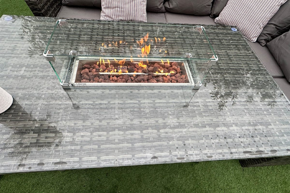 We recommend a 5kg bottle as this fits inside the table, it is not included in the set. Our firepit systems are UKCA and CE certificated and manufactured using grade SUS 304 Stainless Steel ensuring they are weatherproof and made to the highest quality.