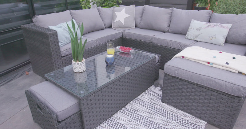 This Vancouver range rattan corner sofa set is ideal for bigger gardens or outdoor spaces. It seats 9 people and has a lot to offer as it comes with a corner sofa, large stool, coffee table and two small stools that can be put under the coffee table when not in use. Our rattan corner sofa set has been galvanised with a galvanised steel framework, preventing rusting as this rattan garden furniture can withstand the British weather. Its modern black colour will match any interior or exterior, making the perfect addition to conservatory or garden. This rattan sofa set is lightweight and to easy to move. You can host parties with confidence, moving your furniture whenever you need to.